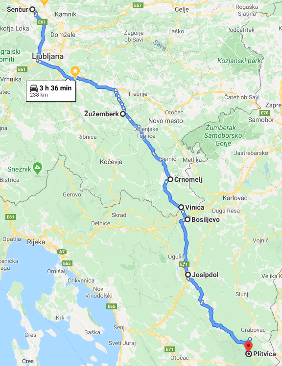 Sobota, 20. 6. 2020 > Šenčur > Žužemberk > Črnomelj > Vinica > Bosiljevo > Josipdol > Plitvička Jezera (238 km, 3h